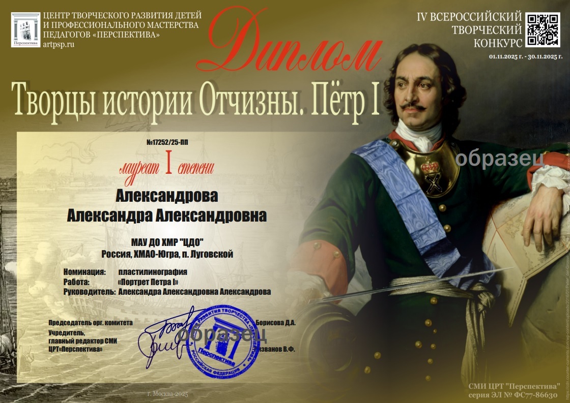 3.3. Призеры конкурса награждаются именными дипломами оригинального дизайна лауреатов I, II или III степени IV Всероссийского творческого конкурса «Творцы истории Отчизны. Петр I».