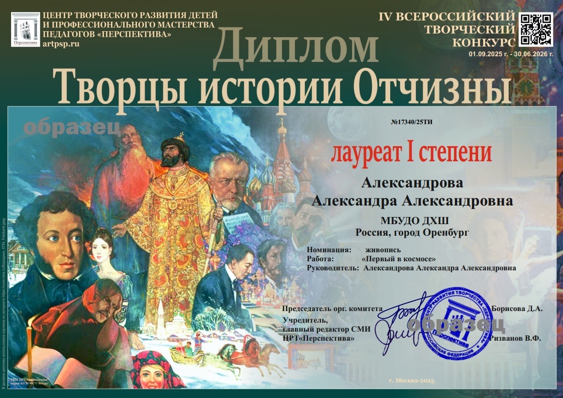 3.3. Призеры конкурса награждаются именными дипломами оригинального дизайна лауреатов I, II или III степени IV Всероссийского творческого конкурса «Творцы истории Отчизны».