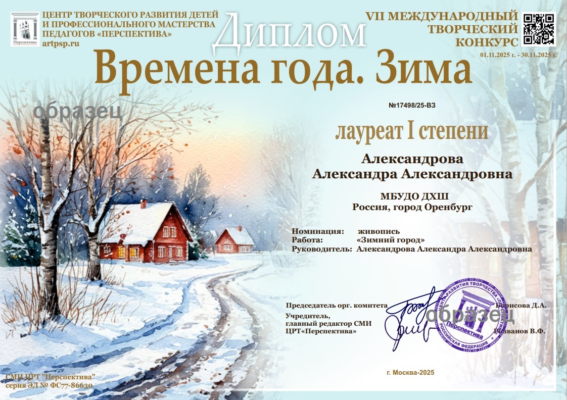3.3. Призеры конкурса награждаются именными дипломами оригинального дизайна лауреатов I, II или III степени VII Международного творческого конкурса для детей и взрослых «Времена года. Зима»